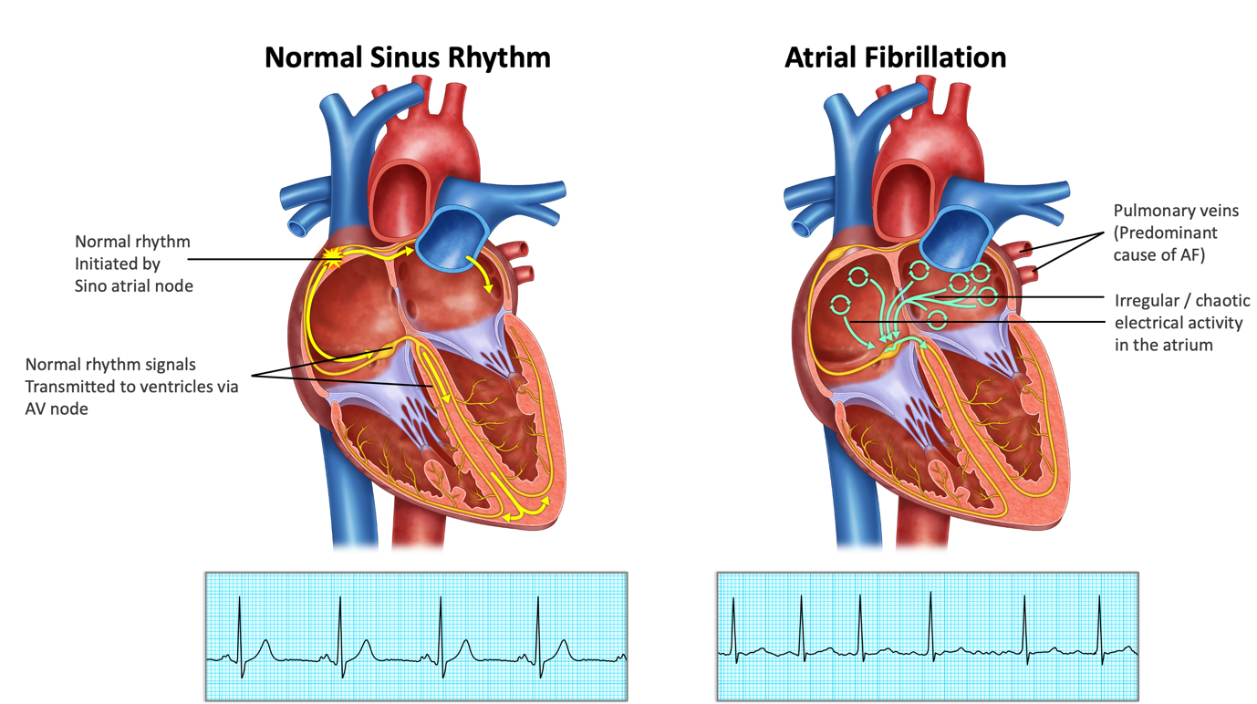 Common causes include underlying heart conditions, high blood pressure, heart failure, or changes in heart structure that develop over time. Other factors such as ageing, sleep apnoea, excess alcohol intake, thyroid disease, and periods of illness or stress can also play a role. In some people, no single clear cause is identified.